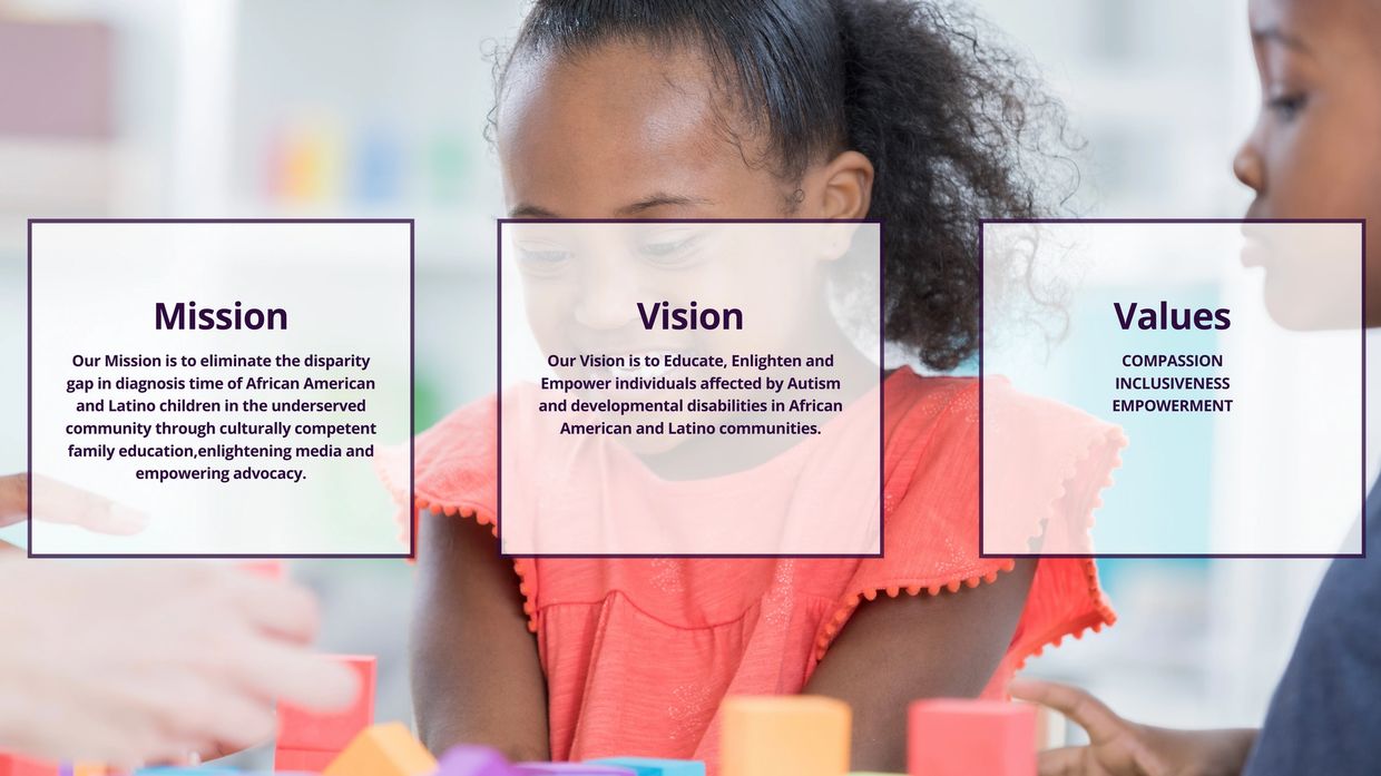 Eliminating the disparity gap in diagnosis time of African American and Latino children in the underserved community through culturally competent family education, enlightening media and empowering advocacy.